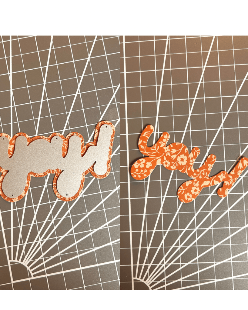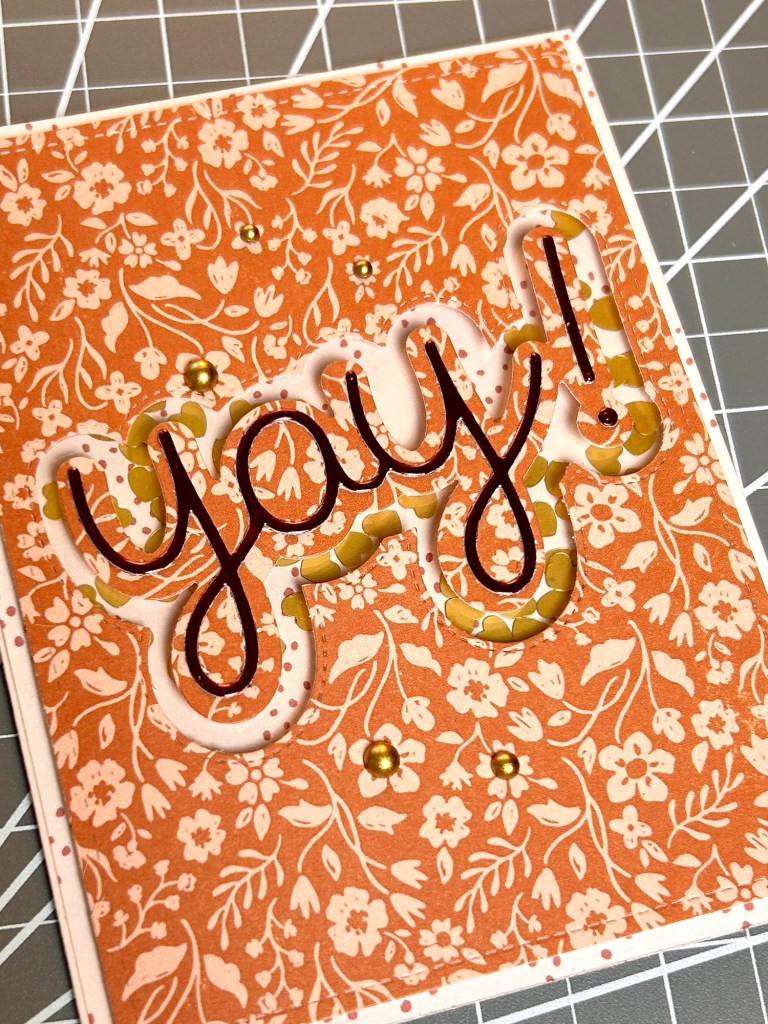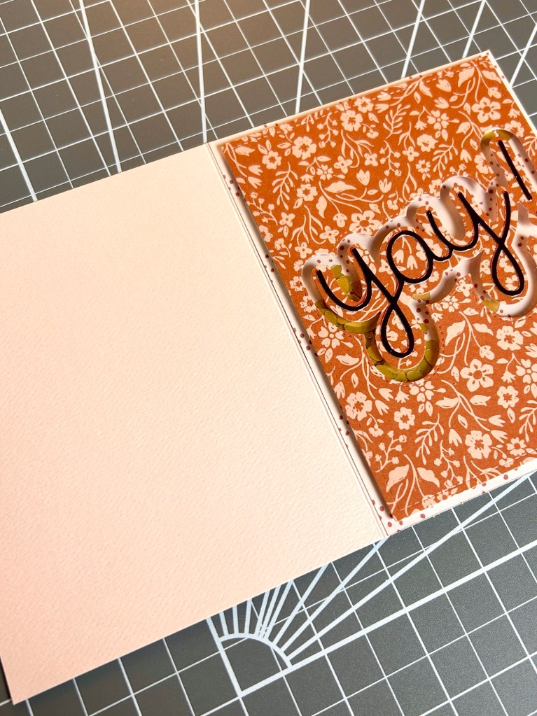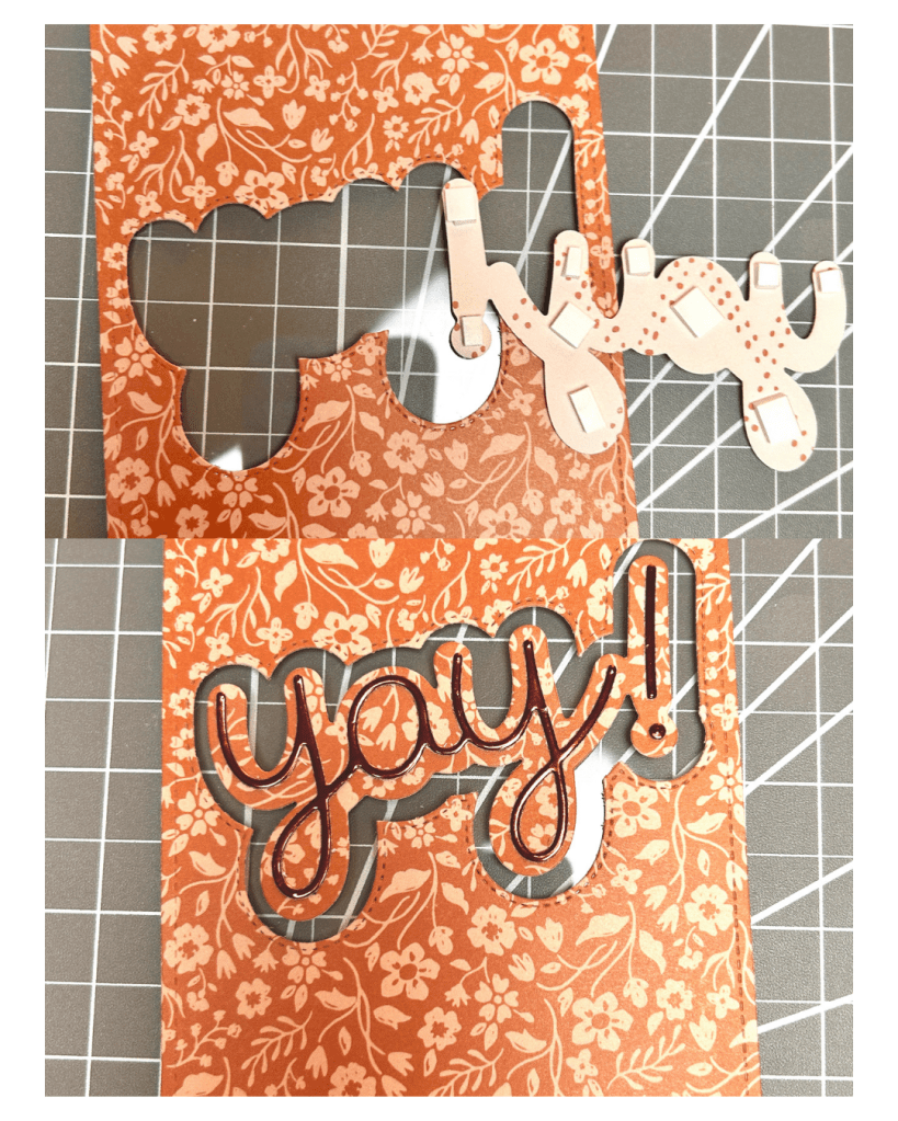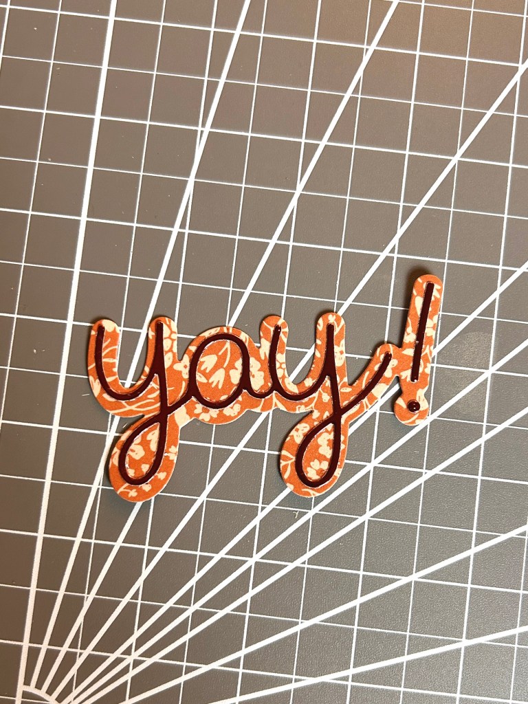 Using a leftover piece of your floral paper, use the next smallest yay die, tape it to your floral scrap to secure it, then run it through your die cutter. I used the yay scrap from the center of the floral panel.