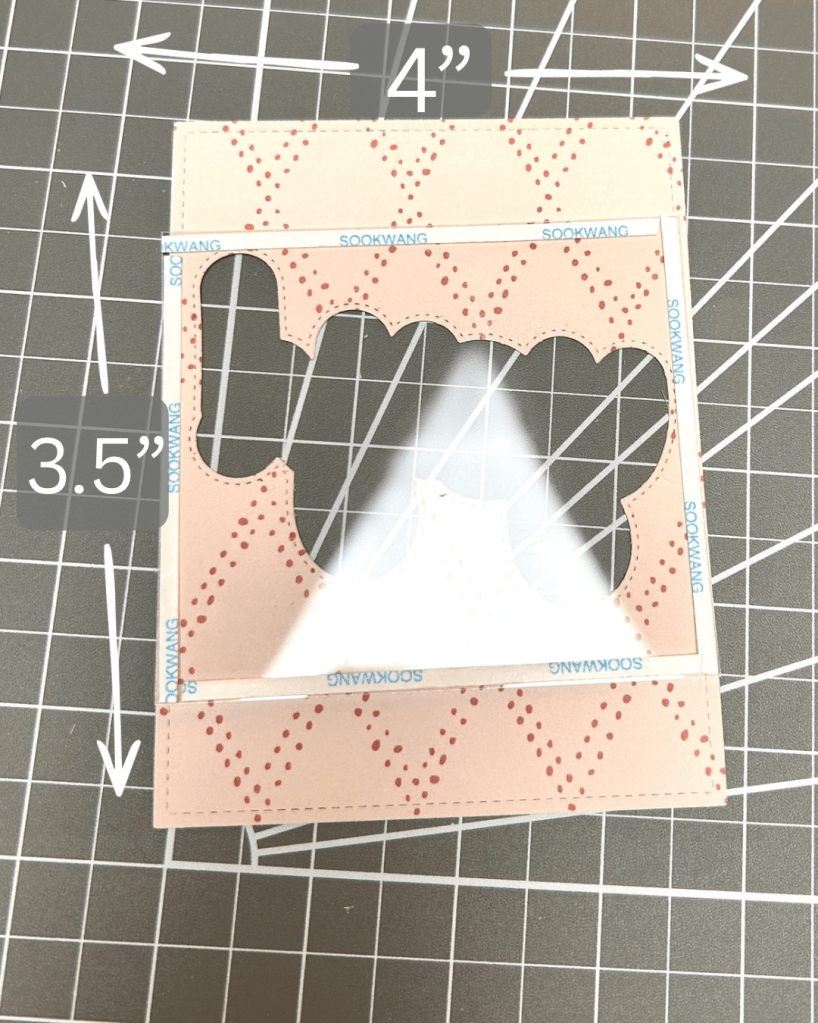 Cut out a piece of acetate measuring 3.5″ x 4″. Adhere this piece to the back of your floral card panel. The 3.5″ side should cover the top and bottom of the large yay-shaped hole on your card panel, and the 4″ side should fit the width of it.