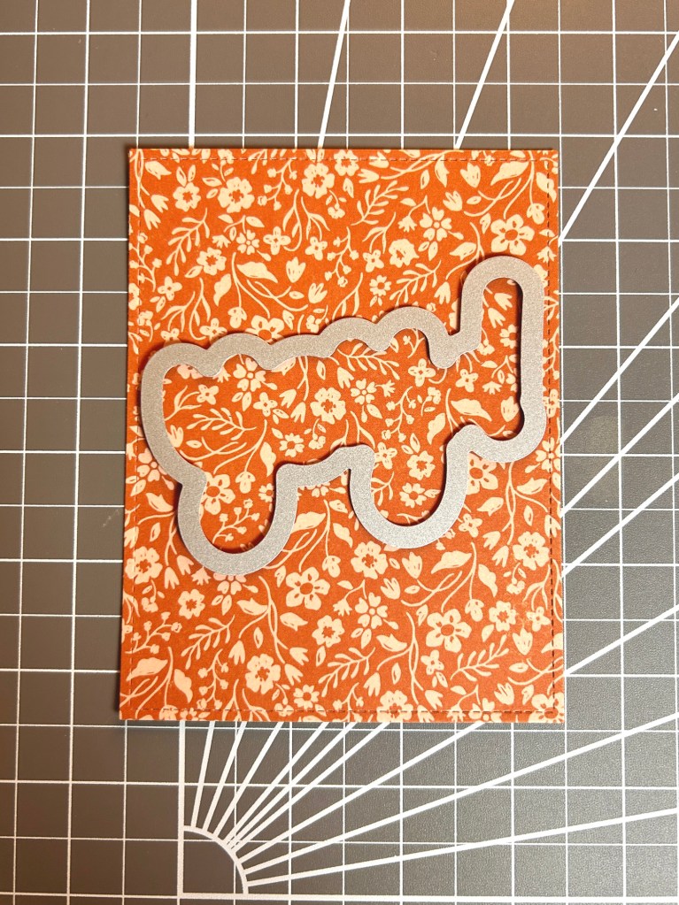 Using the largest Yay die with stitching, place it in the center of your floral card panel, position it slightly diagonal. Then tape down the die to secure it, and run it through your die cutter.