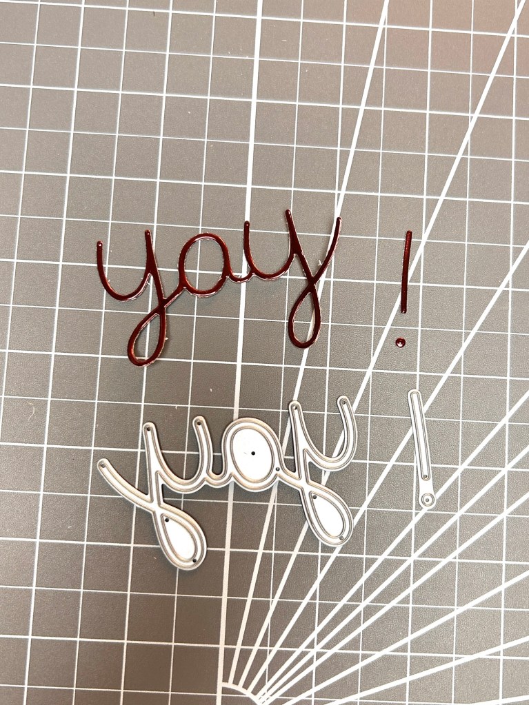 Using the smallest yay die with the exclamation point, place it on a piece of your mirrored card stock and run it through your die cutter.