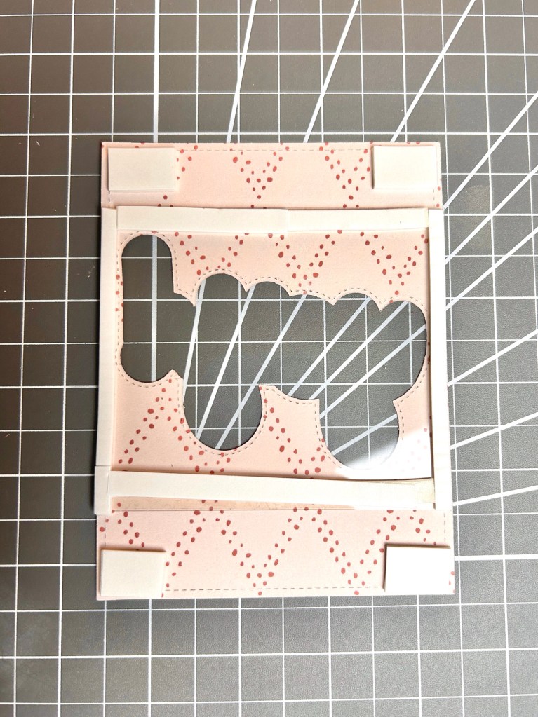 Once your acetate piece is adhered to the back of your floral card panel, take your foam tape and place it on the acetate to fit the shape of your yay. When you turn the floral card panel to face you, the tape should not be visible. The tape will keep your shaker card pieces from falling out. Place more foam tape to your card panel to adhere to your pattern card panel in a later step. Do not remove the backing from the foam tape yet.