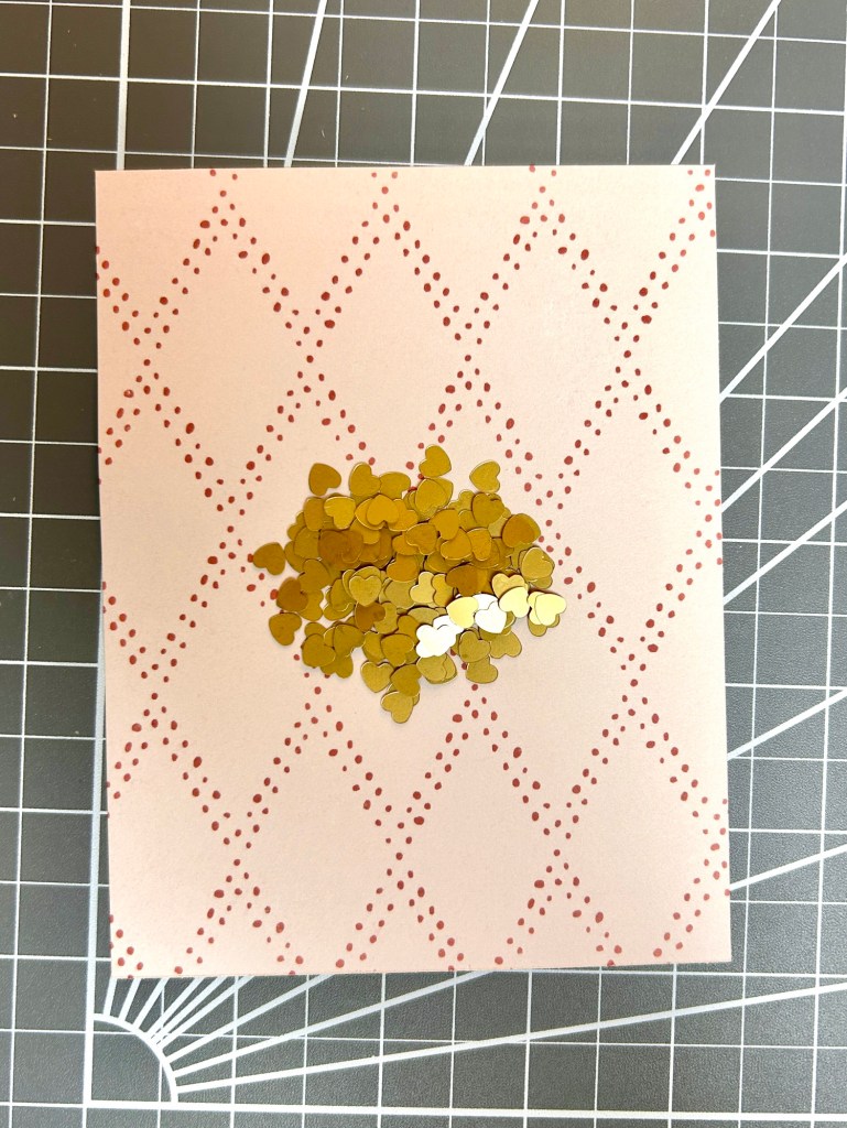Pour out a small pile of shaker card pieces onto your patterned card panel, make sure it’s in a small pile. I used some gold metallic hearts from Hai Supply. Remove the backing from the foam tape on your floral card panel, and carefully place it over the patterned card panel.